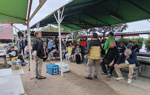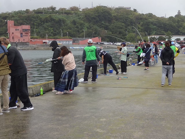 当日は、降水確率が70%近くあり、雨が心配されましたが幸いにも、釣りをしている時間帯は、ほとんど降水がなく参加者の皆さんも釣りを大いに楽しまれておりました。
